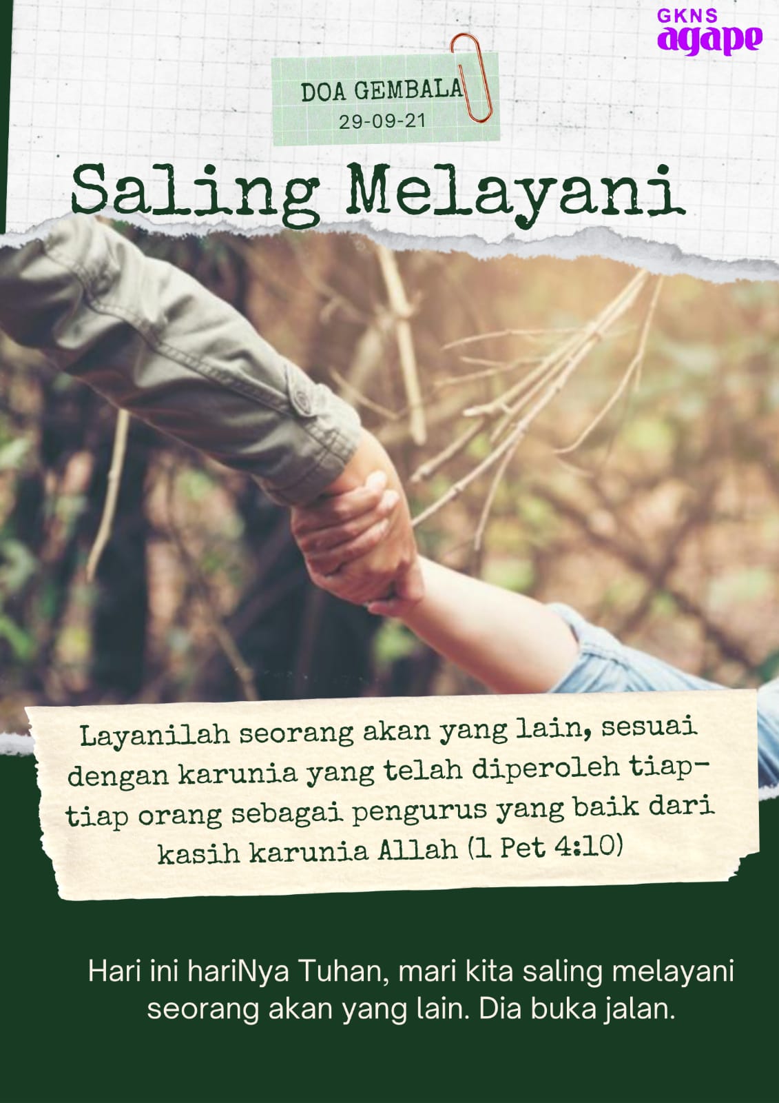 Mari kita saling melayani sesuai dengan karunia yang diberikan kepada kita masing-maing. Haleluya, terpujilah Tuhan kita